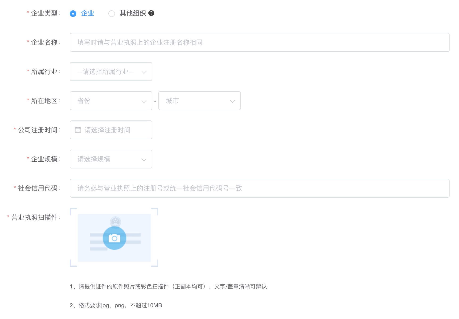 6. 根据页面提示,填写企业信息并上传企业证件扫描件。(机关、事业单位、社会团体、学校和民办非企事业单位和其他机构请选择其他组织)