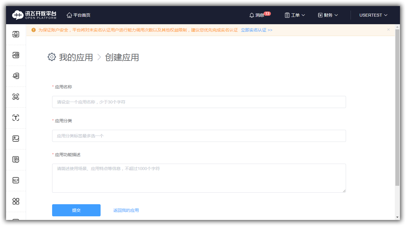 在您完成接入阶段的调试后,若您需要正式商用您的应用,需要先通过实名认证。并且,请准确选择主体的信息,企业用户不能以个人身份认证。